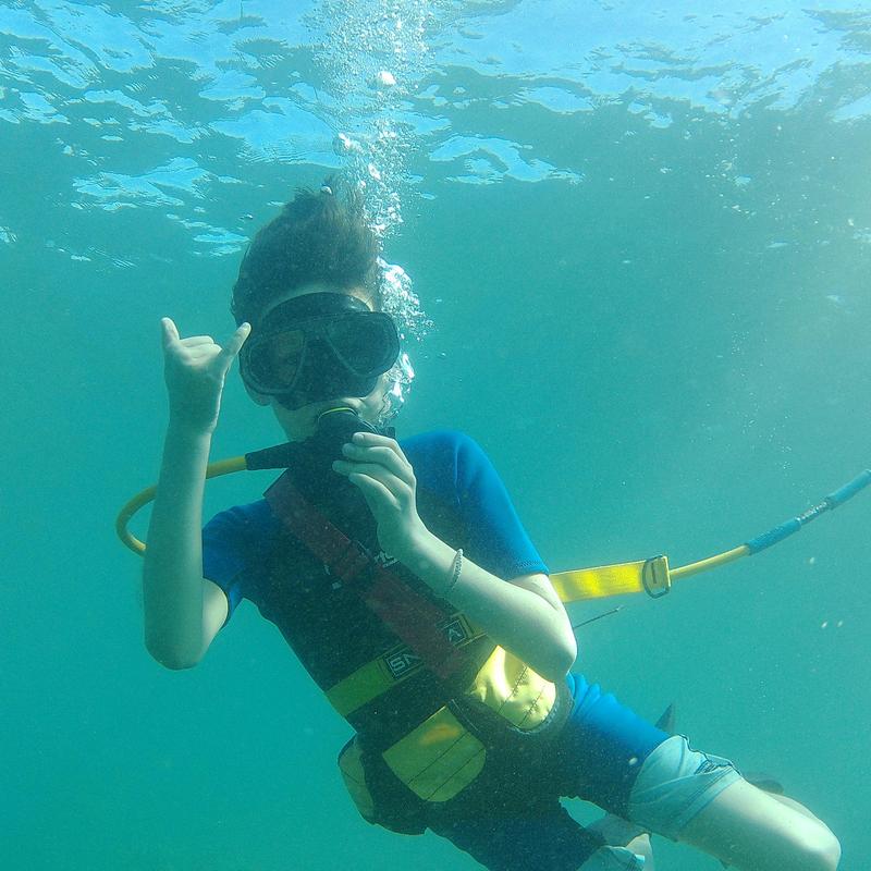 Our specialized equipment for children allows them to float on the surface, while still taking part in the views of their parents or fellow divers just below. Customized, adjustable flotation vests keep them supported on the surface, while age-appropriate mouthpieces connect them to a regulator. A ten-foot air line keeps young participants connected to the SNUBA raft without providing a mechanism for them to become loose in the water. They’re always nearby, and our expert guides will make sure that no one feels left out of the fun.