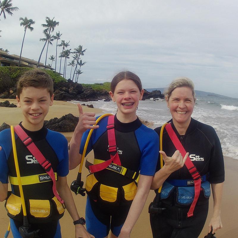 Our SNUBA Doo® program allows even young children who can’t yet swim get in on the action, as they stay toward the surface in an inflatable vest to their comfort level. SNUBA Maui is an incredible way to teach kids about the beauty of nature and a unique appreciation for our oceans, and we love including them in our private dives. We’ll select the best beach for family dive tours, taking daily conditions into consideration to deliver the smoothest experience possible. Our guides will wade in the shallow at the beach with participants until they’re comfortable with the gear and the environment, and will let your group decide where to go next.